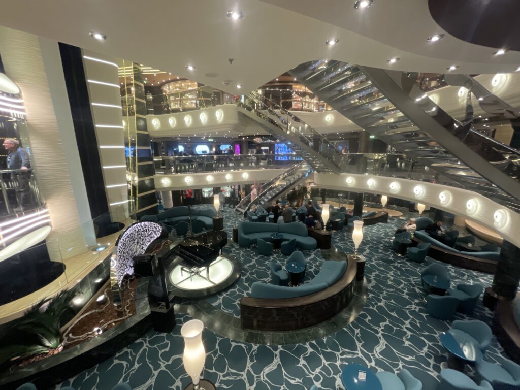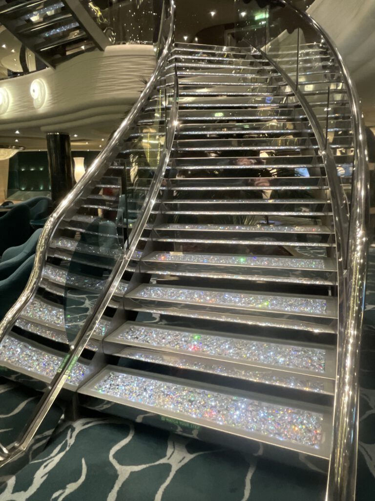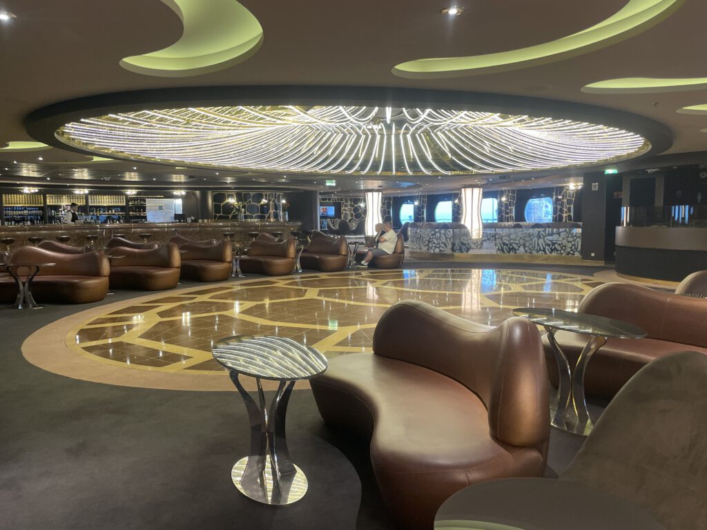 Ein markantes architektonisches Element ist die Treppe im Stil klassischer Ocean Liner, die sich elegant in das darunterliegende Casino windet. Allerdings bringt die offene Bauweise zur darunterliegenden Spielfläche einen klaren Nachteil mit sich: Da das Casino einer der wenigen Raucherbereiche im Innenraum ist, zieht der starke Rauchgeruch ungehindert in die Lounge. Dies kann den Aufenthalt für Nichtraucher erheblich beeinträchtigen und schmälert den ansonsten hochwertigen Eindruck der Bar und sorgte auch dafür, dass ich mich recht selten hier aufgehalten habe.