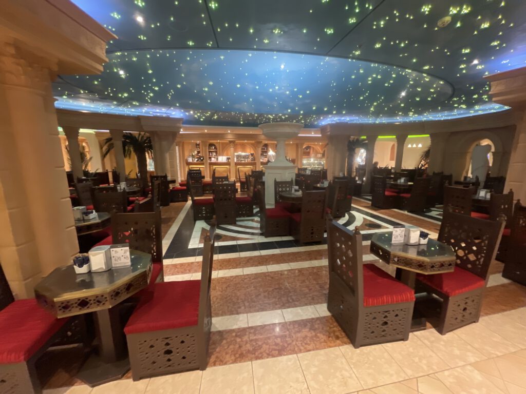 Die Safari Lounge ist eine elegante Bar und ein Unterhaltungspunkt auf dem Schiff, die mit ihrem exotischen Safari-Thema sofort ins Auge fällt. Die Einrichtung kombiniert natürliche Holztöne und afrikanische Einflüsse und schafft eine warme, einladende Atmosphäre. Hier können Gäste Live-Musik, Tanzdarbietungen und andere Shows genießen. Die Safari Lounge eignet sich auch hervorragend für einen Drink in einer entspannten Umgebung, während man sich in die musikalischen Darbietungen vertieft oder die lebhafte Atmosphäre aufnimmt. Am Abend finden hier meist die Motto-Parties, wie die ABBA-Party oder die White Party